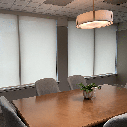 Commercial and Residential applications for roller shades. Help reduce glare and rejection of heat through windows. Allows for conference rooms to have a more comfortable setting while also blocking external light for video situations. Dual shades for solar, privacy and blackouts.